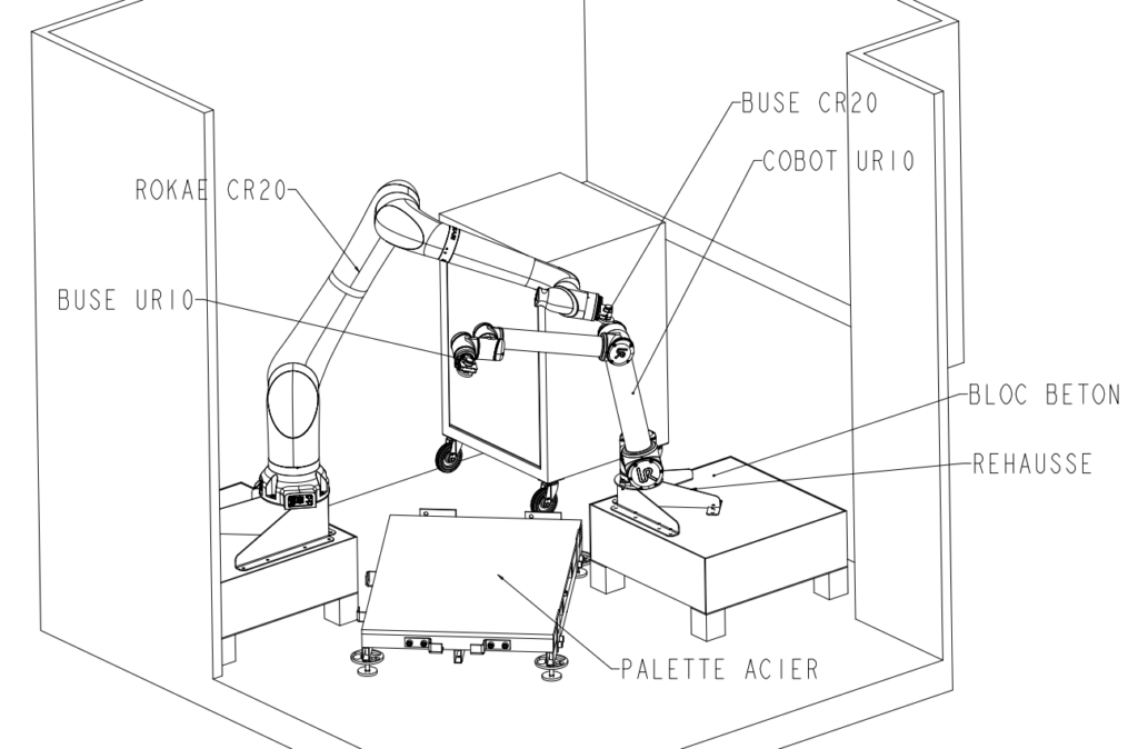 À notre arrivée, l’installation existante présentait plusieurs limites logistiques et techniques : le robot UR10e sur son chariot, la pompe à béton et des palettes en bois de fortune encombraient un espace d’atelier déjà très restreint. L’enjeu est devenu encore plus grand lorsque le laboratoire nous a fait part de sa volonté d’installer un second robot industriel, le ROKAE CR20, pour pousser plus loin ses recherches et ses travaux pratiques